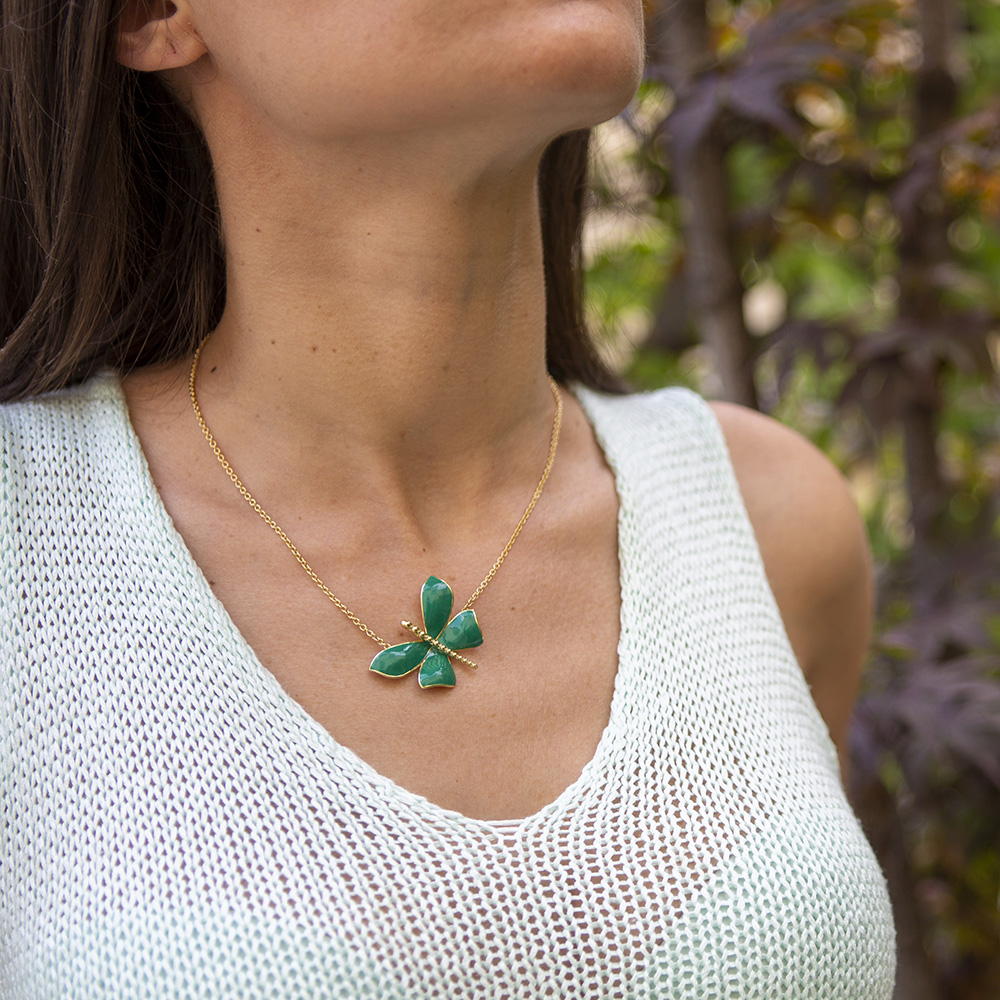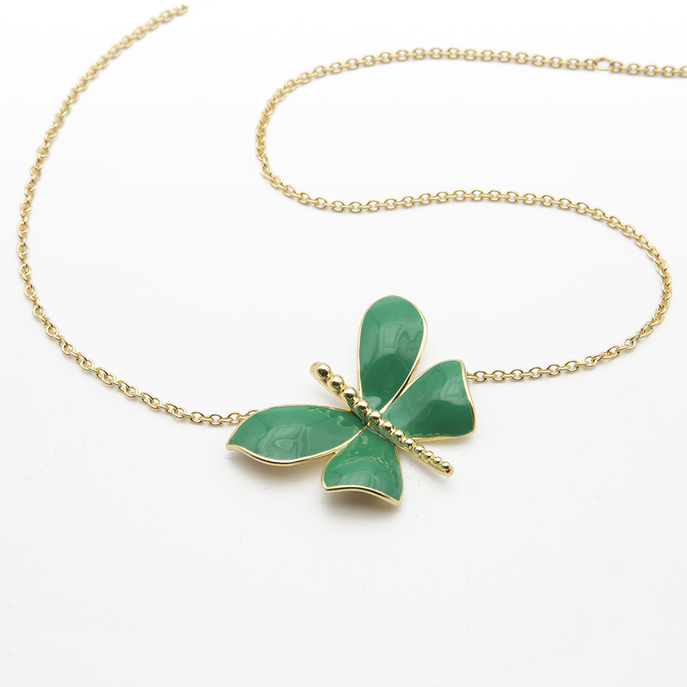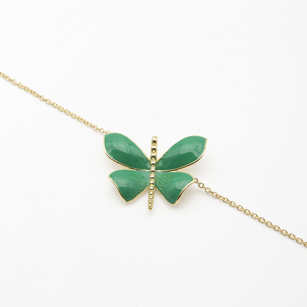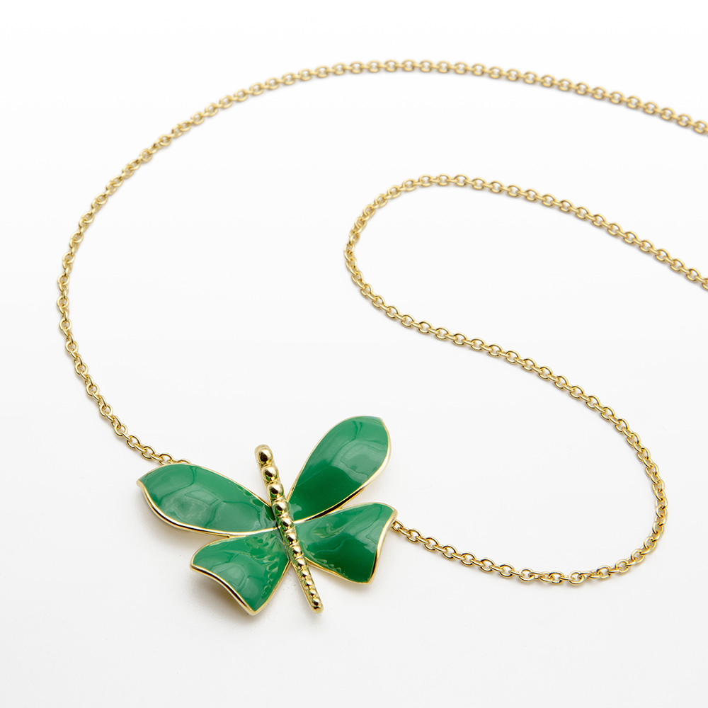 Four wings 18kt gold necklace little Butterfly with green enamel
