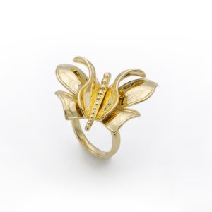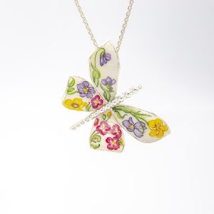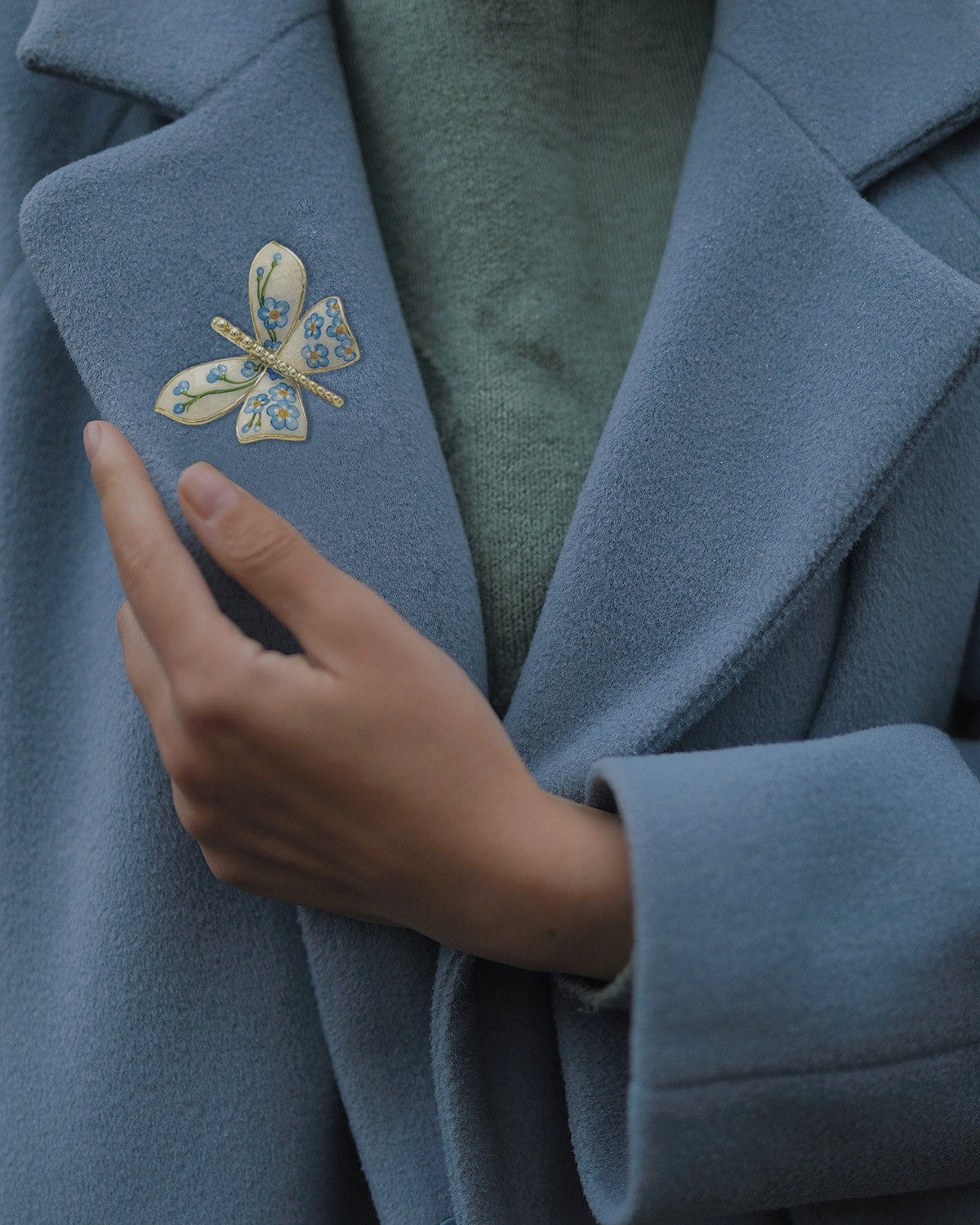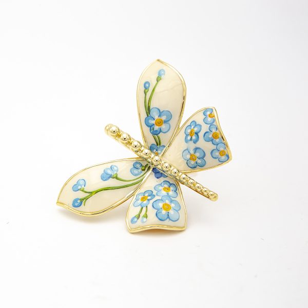 Four wings 18 kt gold brooch big Butterfly with floral miniature enamel