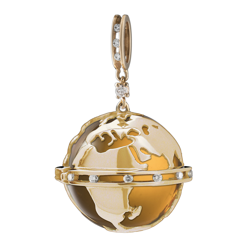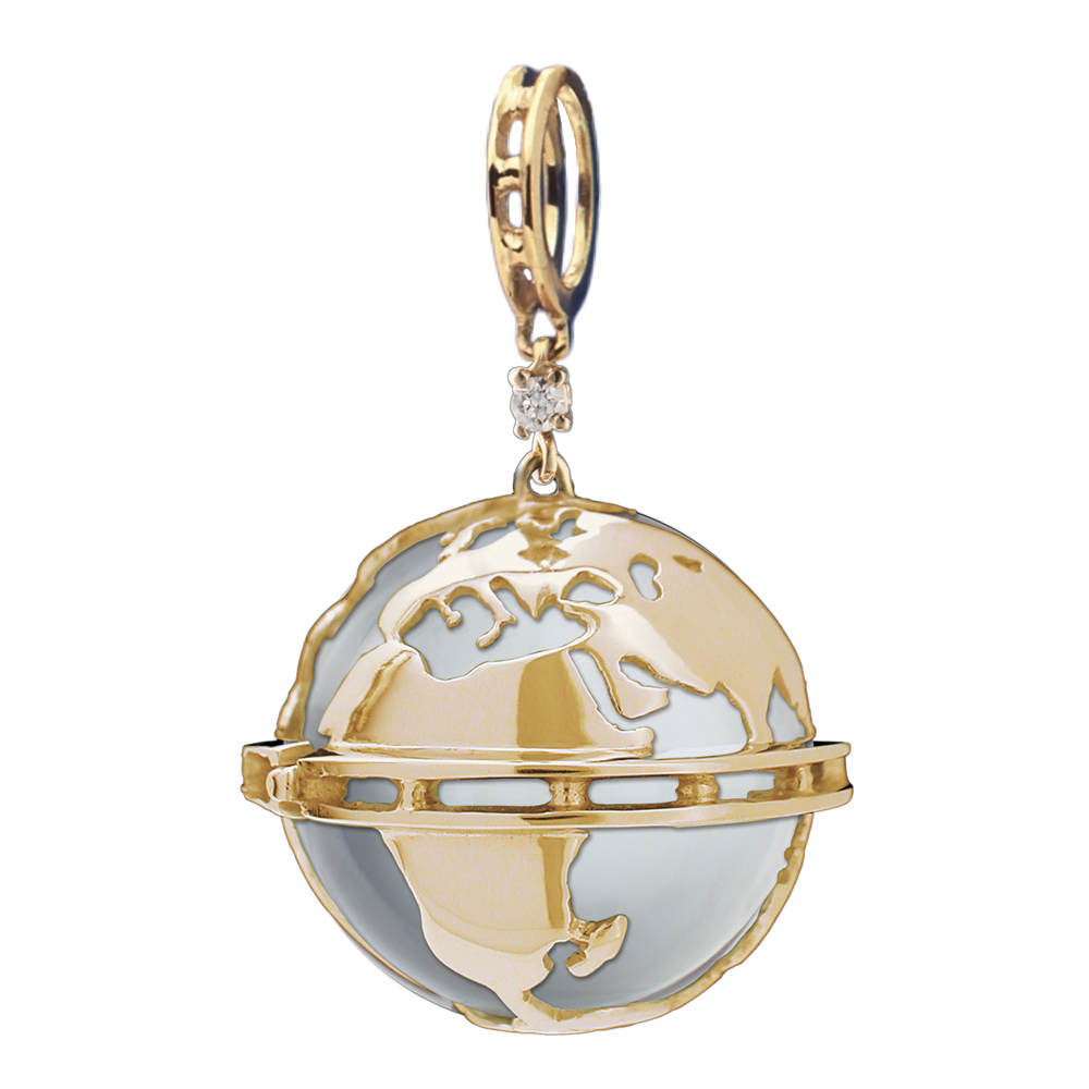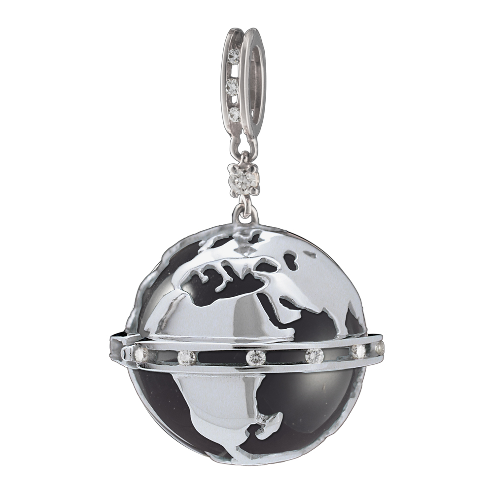 Oro bianco con 20 Diamanti ct. 0,38 e sfera di Cristallo di Rocca. Diametro equatore mm 22, diametro pendente mm 20, diametro sfera interna mm 18.