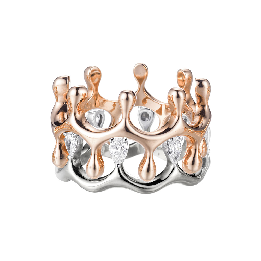 Anello laterale in oro bianco 18 kt, 8 diamanti a goccia ct. 0,70 e anello centrale in oro rosa 18 kt