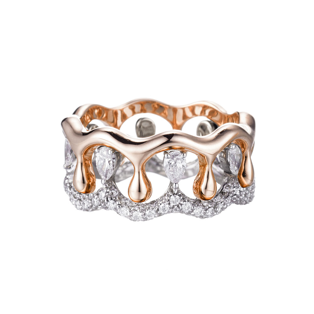 Anello laterale in oro rosa 18 kt e anello laterale in oro bianco 18 kt, pavè di diamanti ct. 0,75 e 8 diamanti a goccia ct. 0,70
