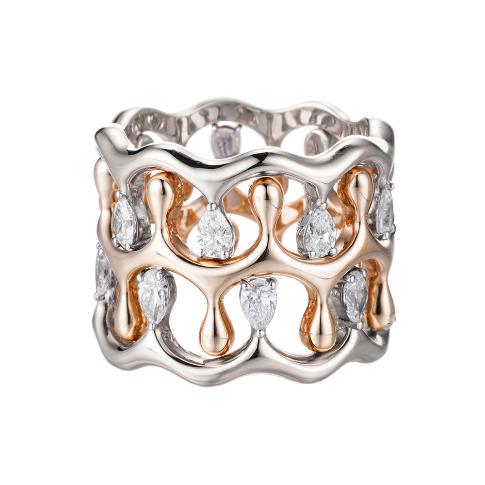 Anelli laterali in oro biacno 18 kt e 16 diamanti a goccia ct. 1,40 e anello centrale in oro rosa 18 kt