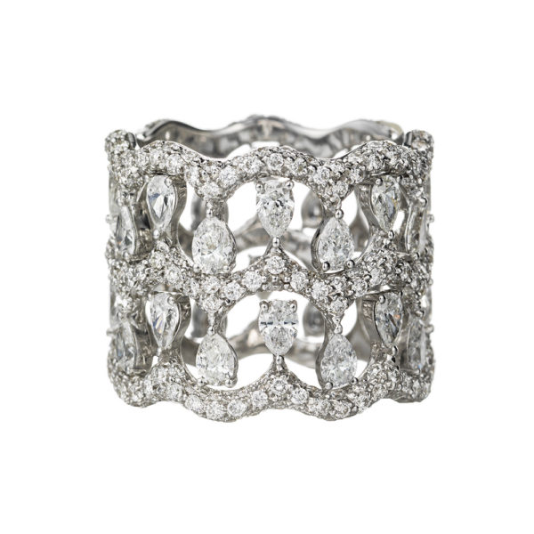 Anello in oro bianco 18 kt, pavè di diamanti ct. 2,25 e 32 diamanti a goccia ct. 2,80